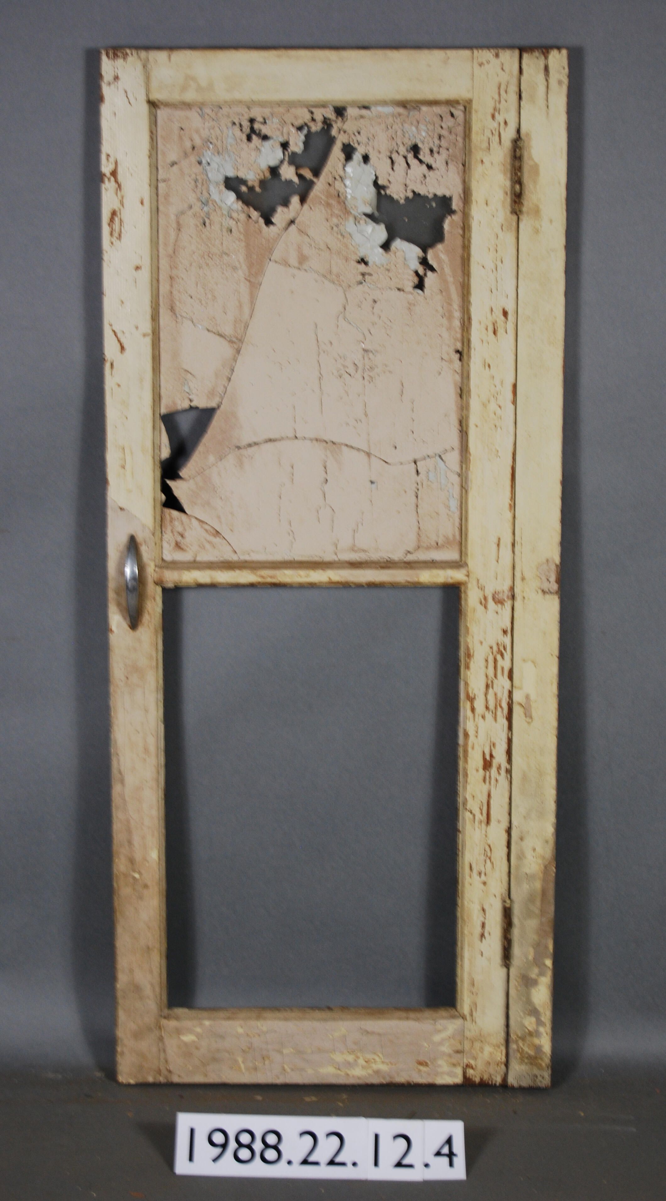 Single panel exterior door Has single opening with clear glass pane. Applied moldings above and below opening. Has mortise lock, two escutcheon plates, and three hinge leaves. Painted blue on one side, and white on the other side.