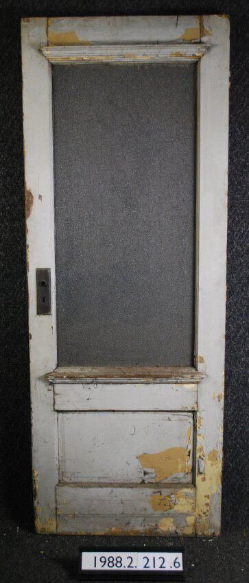 Single panel exterior door Has single opening. with obscure molded glass. Applied moldings above and below opening. Has mortise lock, two escutcheon plates, and three hinge leaves. Painted grey.