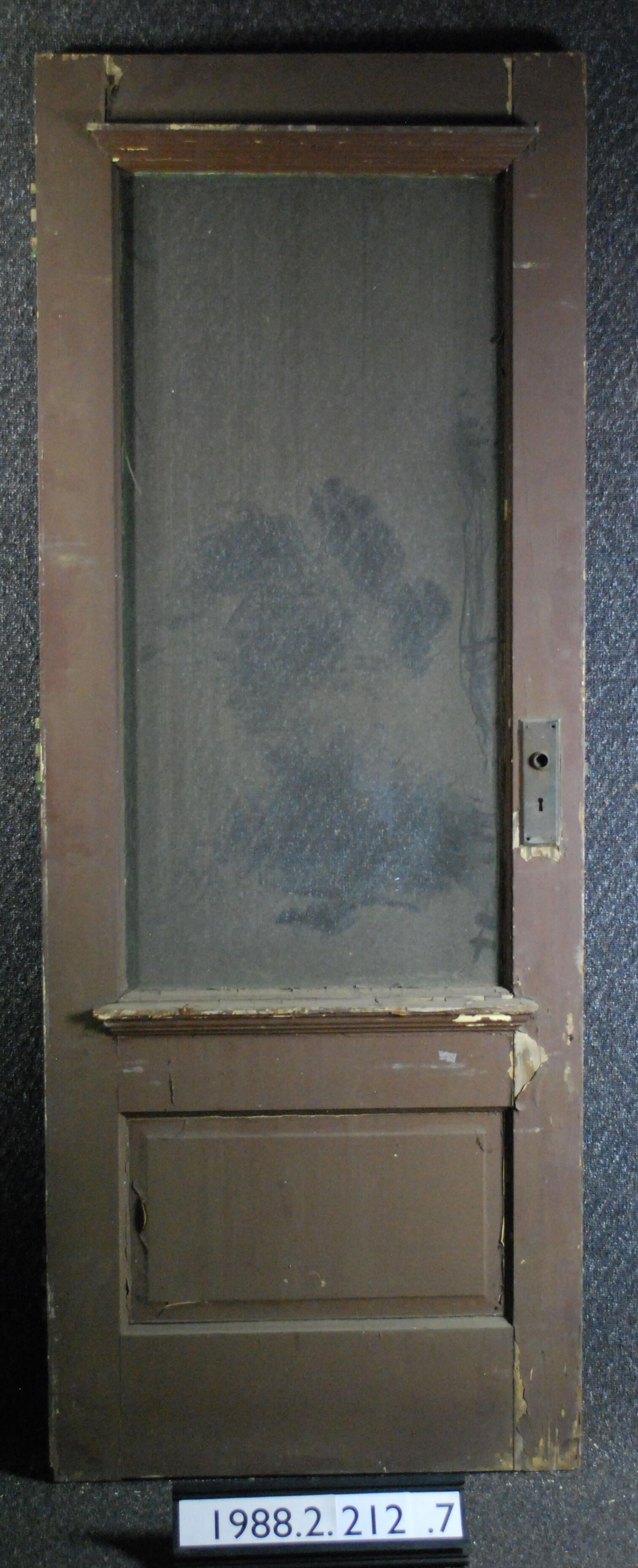 Single panel exterior door Has single opening. with clear glass pane. Applied moldings above and below opening. Has mortise lock, one back plate, and three hinge leaves. Painted brown on one side, and green on the other side.