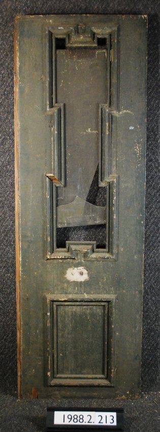 Single panel exterior door Panel has single sash opening. with clear (broken) glass pane. Applied moldings. Door shortened at both top and bottom. Has strike plate and rimrock strike plate and sliding bolt. All other hardware is missing. Painted green on one side, and green / white on the other side.