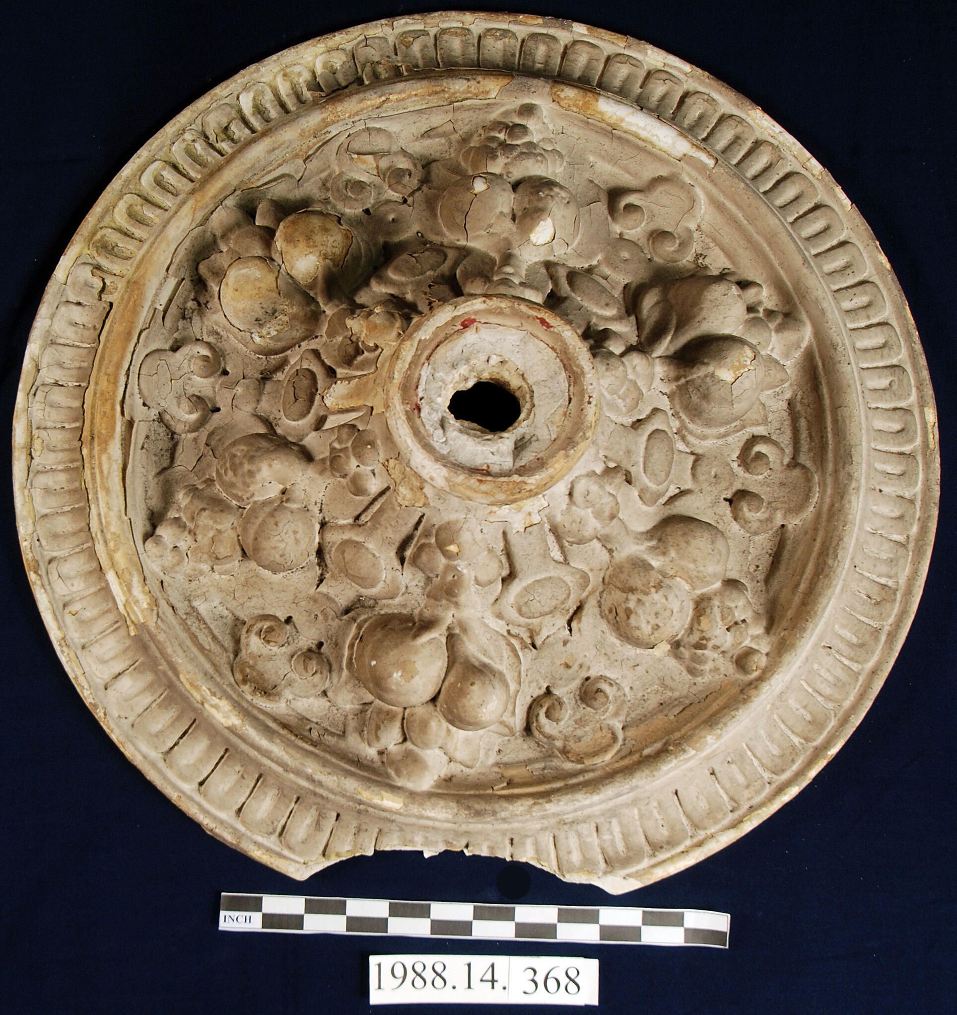 Historic plaster circular ceiling medallion. Fruit clusters, scroll motif. Perimeter has fluted dentils. Loose facing. Detached fragment located October 29, 2013. Off-white paint.