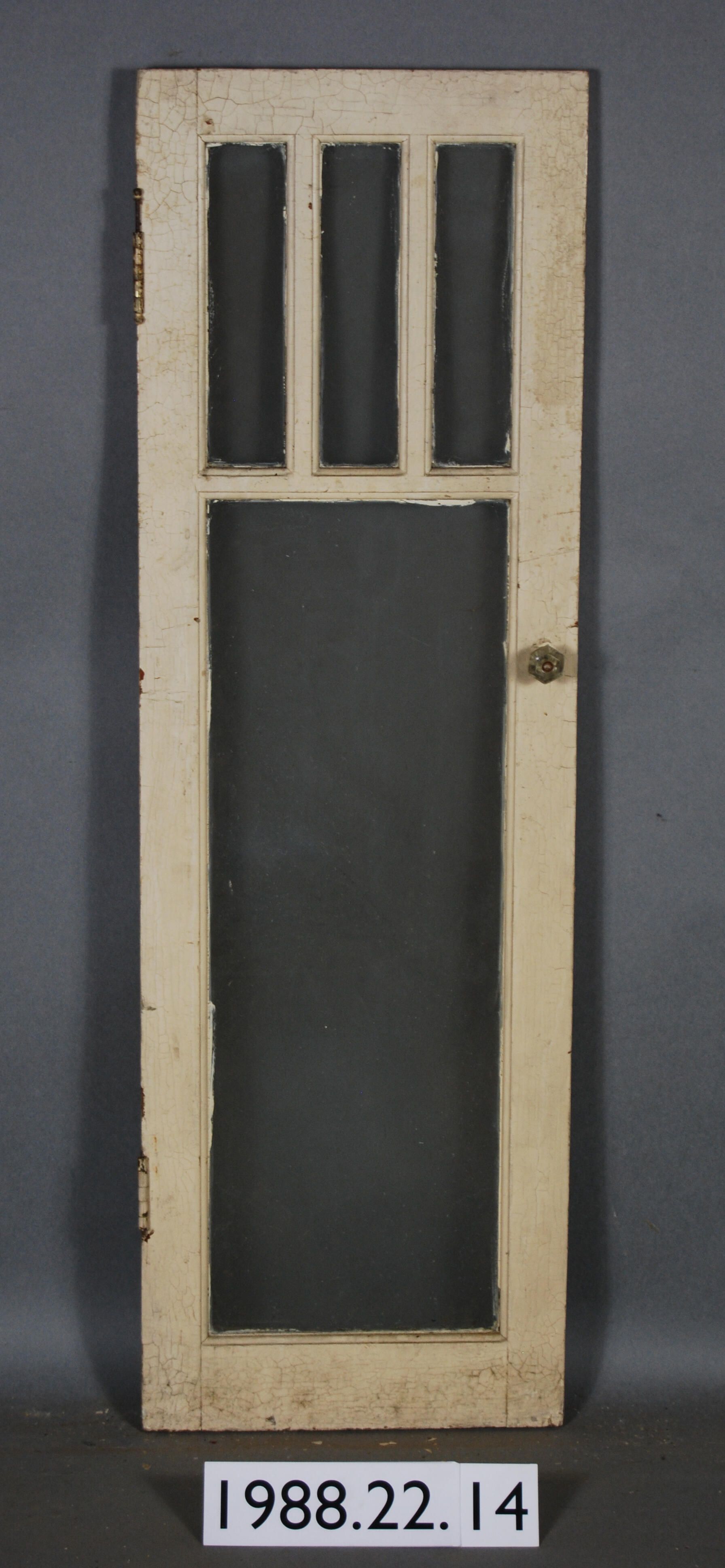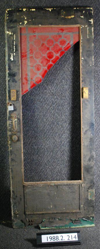 Exterior commercial door Has single opening - originally with clear glass pane (broken / incomplete and redecorated with red paint). Door has sheet metal panel, cylinder dead bolt lock, padlock, security bar hardware and brass handled and sliding bolt. All other hardware is missing. Painted black.