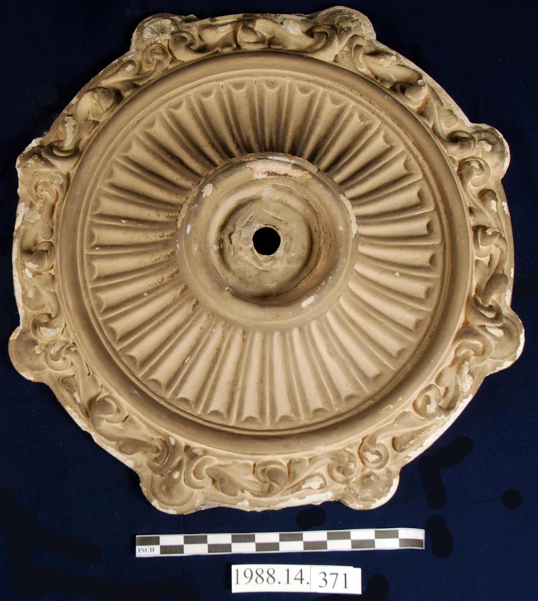 Historic plaster circular ceiling medallion. Stylized leaves around outside rim and 8 scallops. 6" fluted ribs radiating from center ring. Soiled cream colored paint. See 1988.14.370. Has attached ceiling plaster.