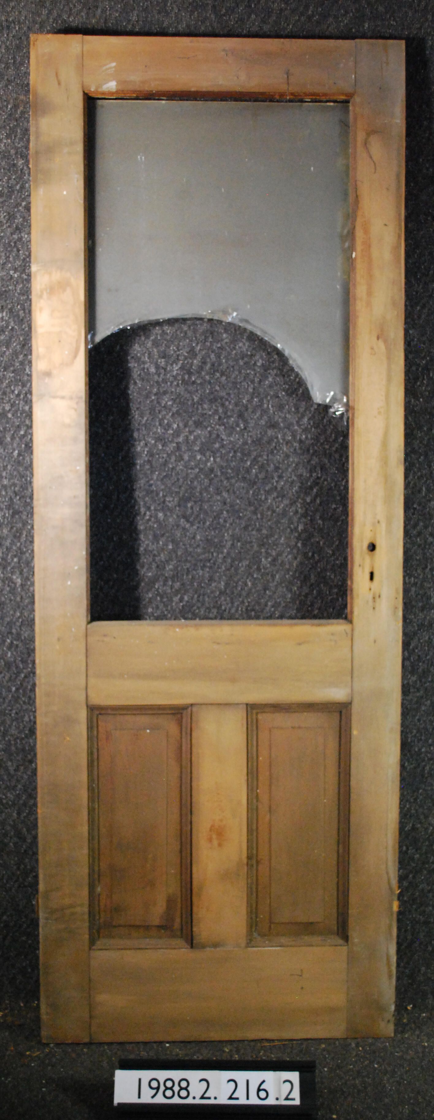 Two panel exterior / interior door. Single opening with frosted glass pane (broken/partially missing). Edge of door is damaged with dry rot. Has two hinge leaves. All other hardware is missing. Stripped on one side and varnished on the other side.