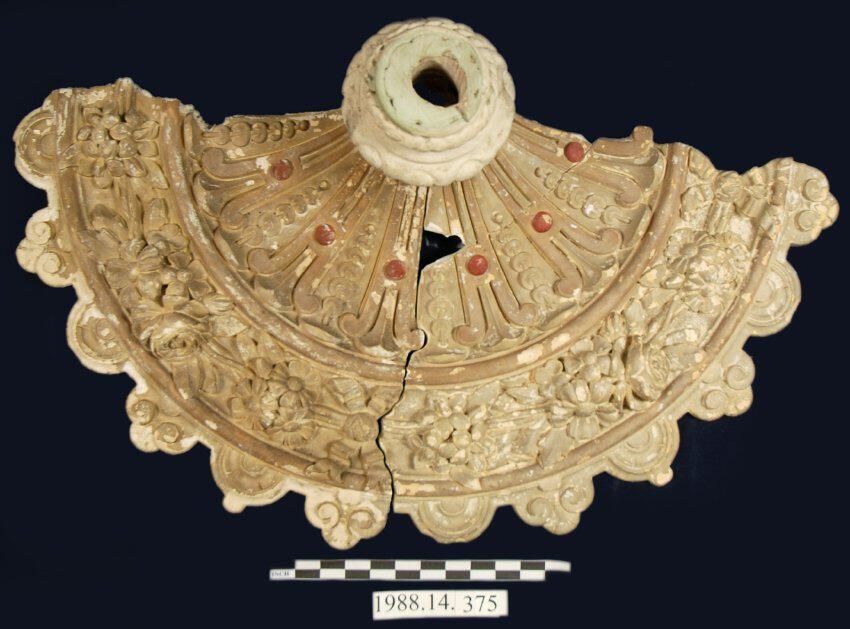 Historic plaster ceiling medallion. Detached centerpiece with rope motif. Originally medallion had four segments to compose circular medallion - now has only two. One segment broken. Scrolled stylized leaf and disc. Bead / floral / leaf / ribbon motif. Outer perimeter has appendages with alternating scallop and scroll. Partially stripped down original paint. Same pattern as 1988.14.376.