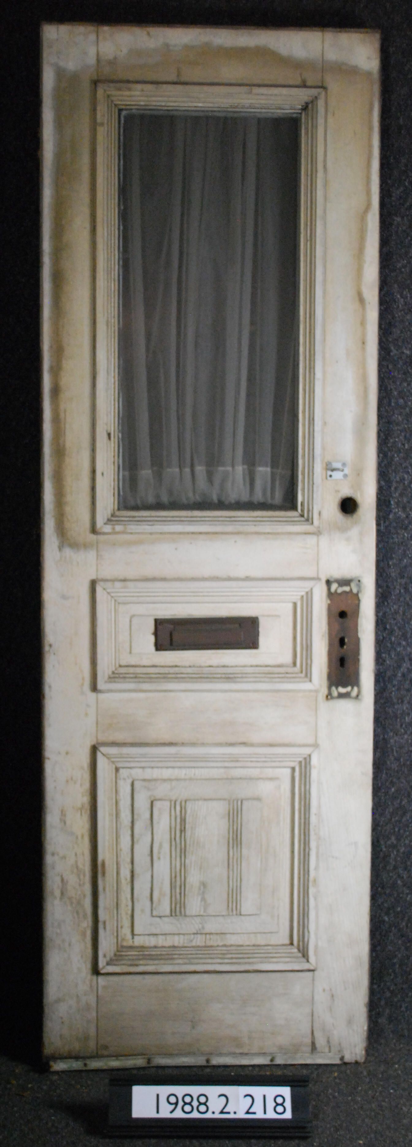 Two panel exterior door. Applied bolection moldings. Single sash opening with clear glass pane. Has cloth curtain. Has later mail slot. Has P loop and two modern hinge leaves. Painted white on one side and green on the other side.See 1988.2.218.1