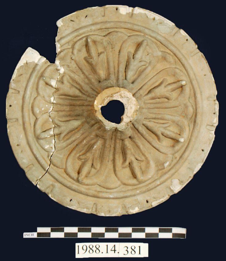 Historic plaster circular ceiling medallion. Boken. Missing piece. Stylized leaf motif.