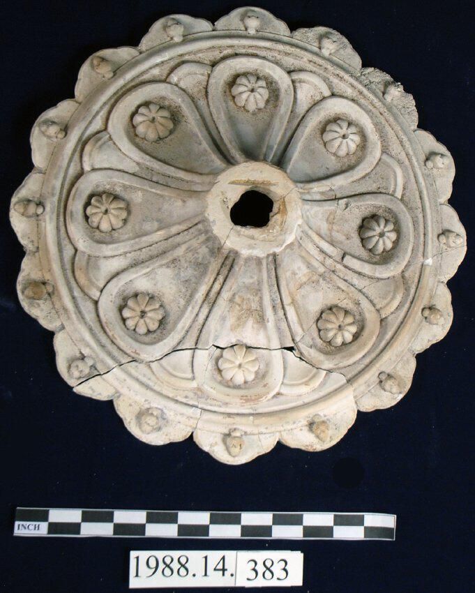 Historic plaster circular ceiling medallion. Center piece missing. Has central hole. Stylized leaf or petal motif with repeating rosettes. Perimeter has series of repeating appendages with floral bud motif. Stripped of paint. Broken, but nearly complete. Reverse has incised score marks.
