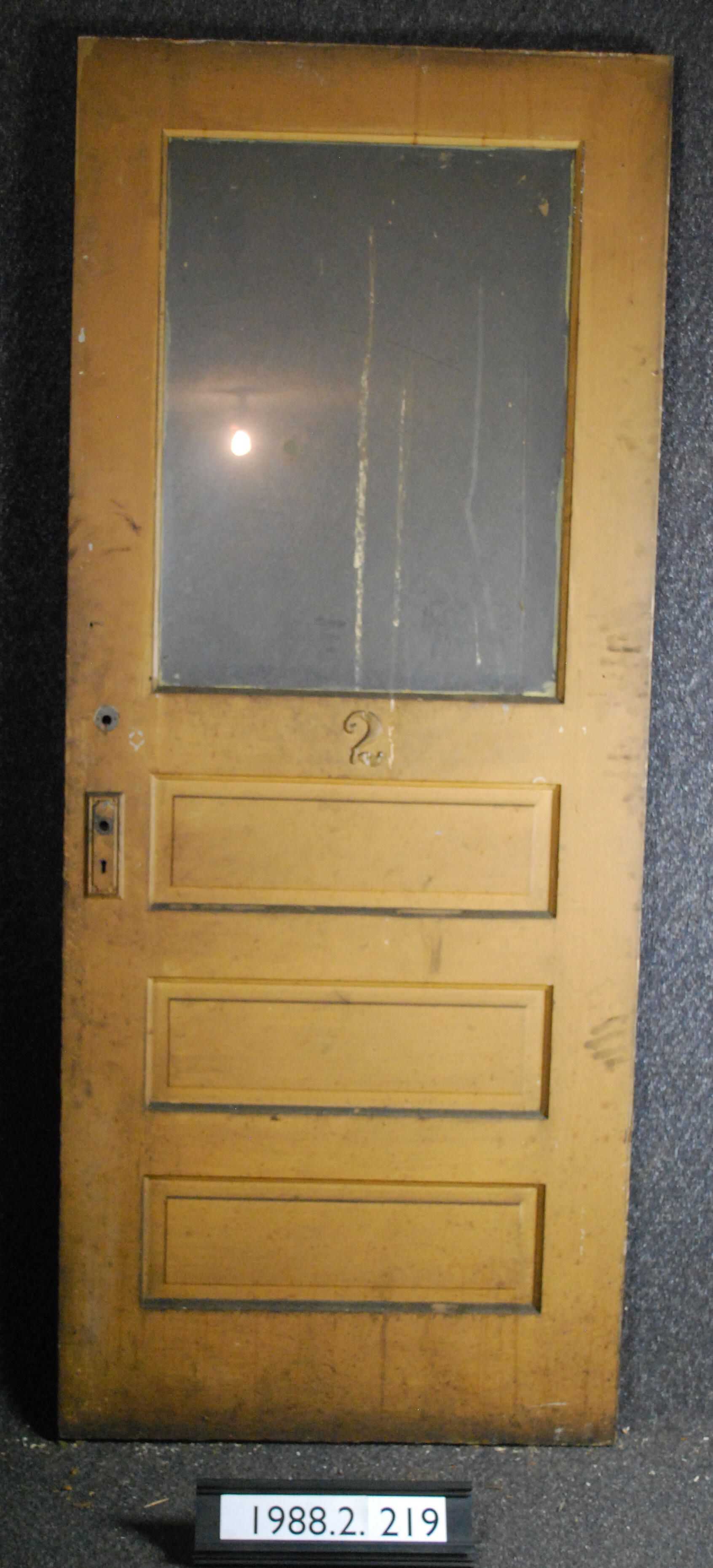 Three panel exterior door. Single sash opening with clear glass pane. Has mortise lock. and two back plates. All other hardware is missing. Has metal NUMERAL "2". Painted tan / brown.