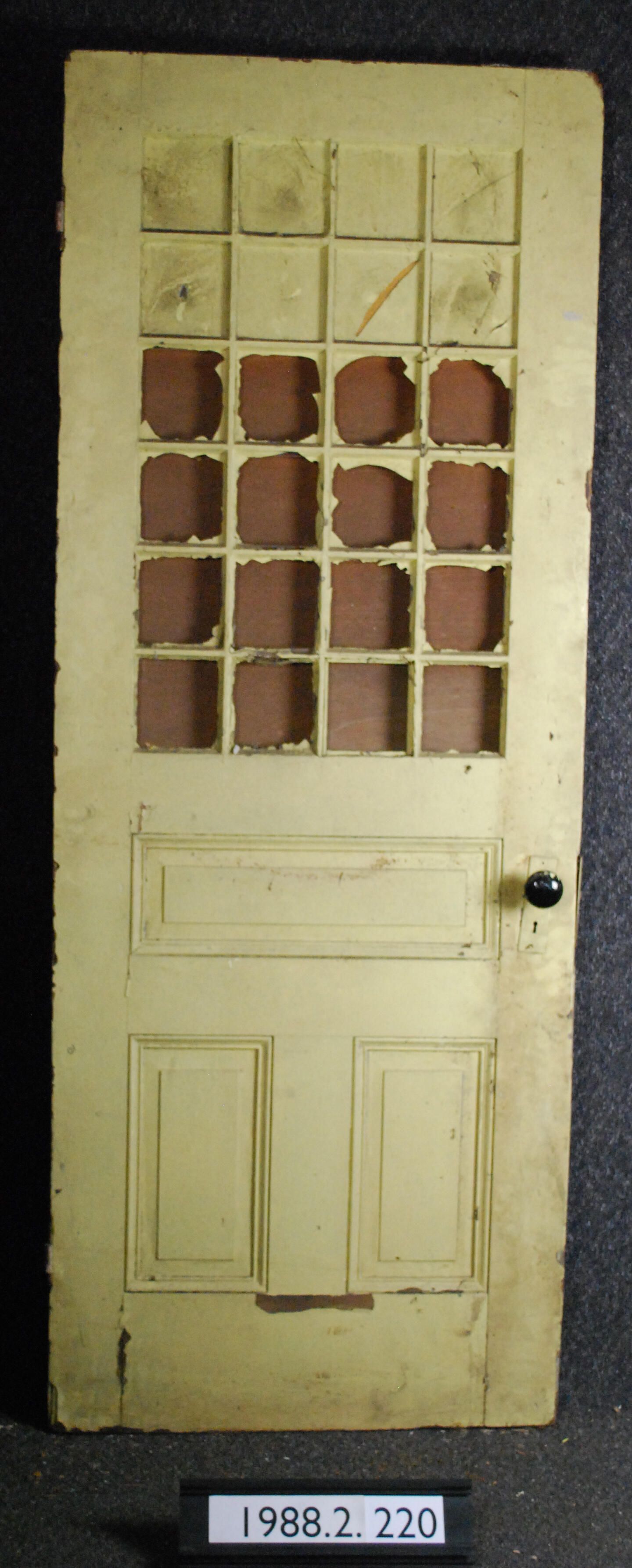 Three panel exterior door. Twenty-Four openings. Eight panes remaining - the rest are broken. Clear glass, Applied moldings. Has mortise lock, two back plates, two black ceramic knobs,, and two cast iron hinge leaves. Painted yellow on one side and beige on the other side.