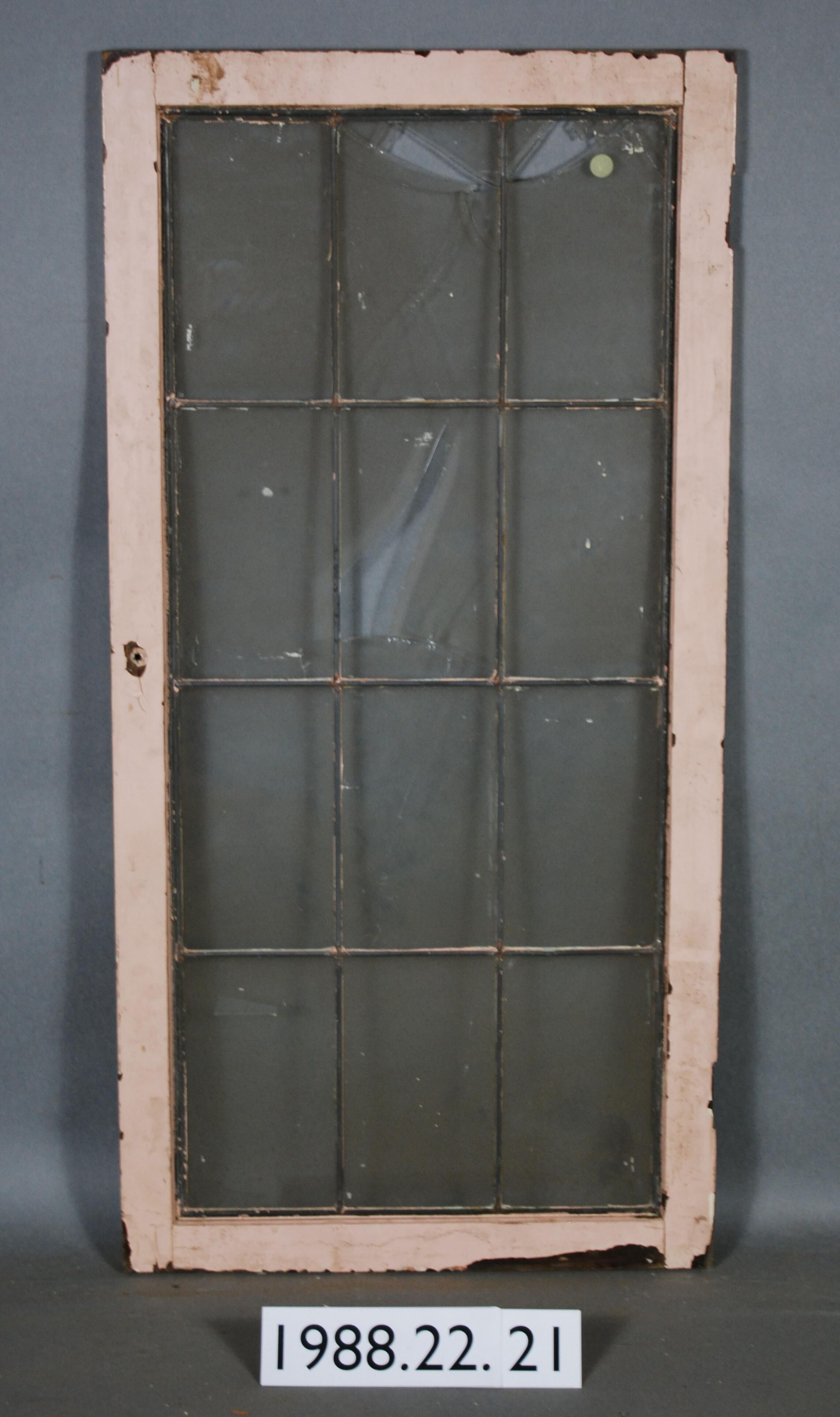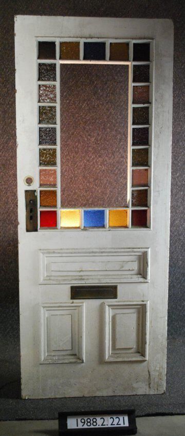 Three panel exterior door. Applied bolection moldings. Multiple sash openings. Central glass pane is missing. Red, yellow, and blue glass squares. Has mortise lock. Key hole escutcheon. Two hinges: (Branford works), and curtain brackets. All other hardware is missing. Painted white on both sides.