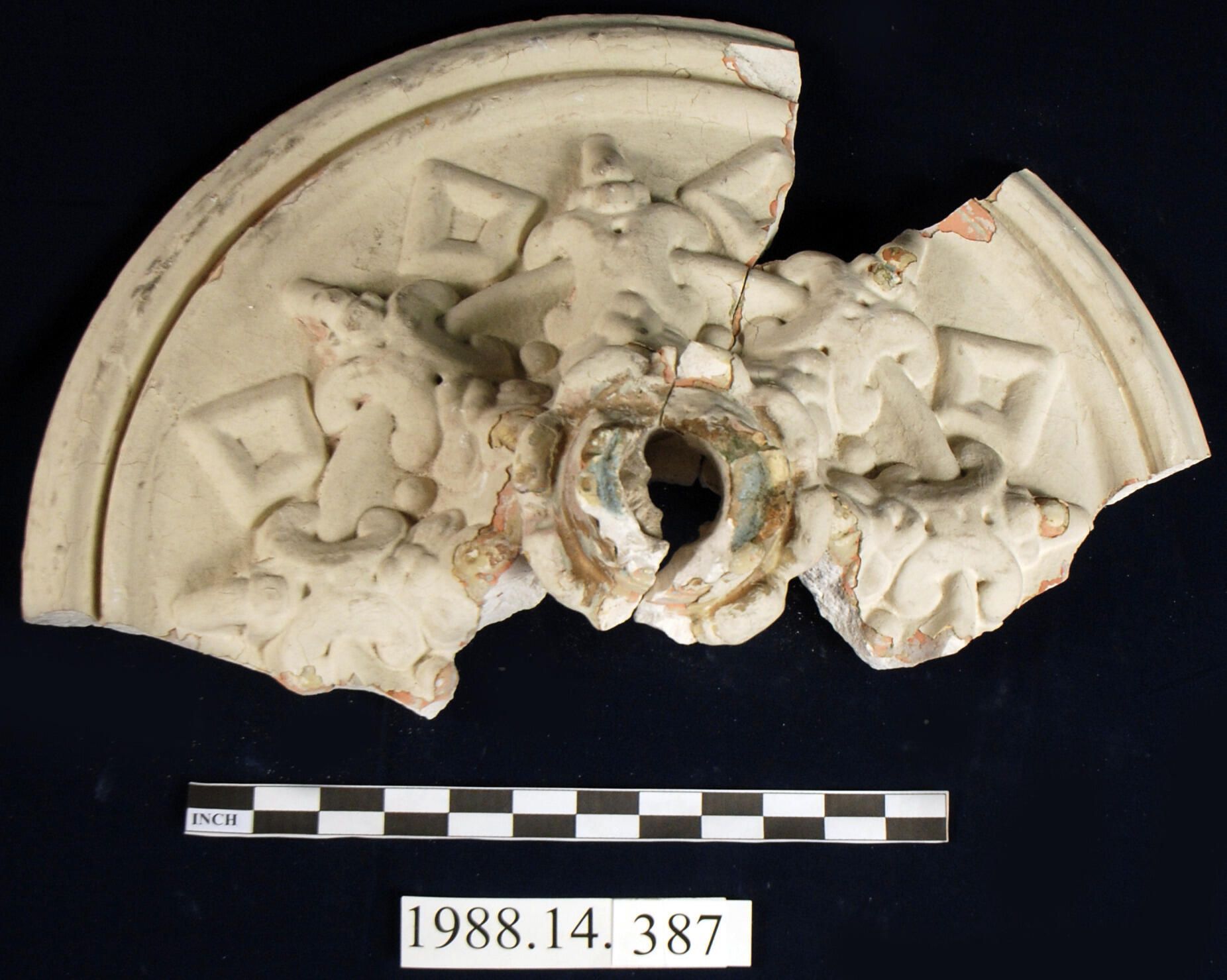 Historic plaster circular ceiling medallion. Broken. Missing pieces. Stylized Botanical / Geometric motif. Has detached broken center piece with scalloped rim. Original multiple layers of paint over-painted off-white.