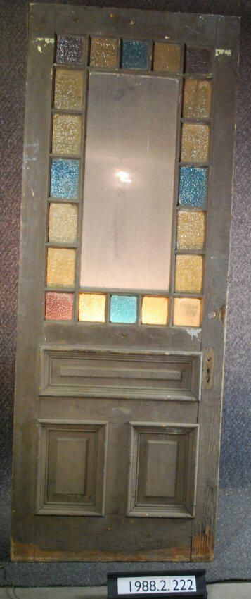 Three panel exterior door. Applied bolection moldings. Multiple sash openings around central glass pane. Red, yellow, and blue glass, machine rolled. One has been replaced. All other hardware is missing. Painted brown on one side and off-white on the other side.