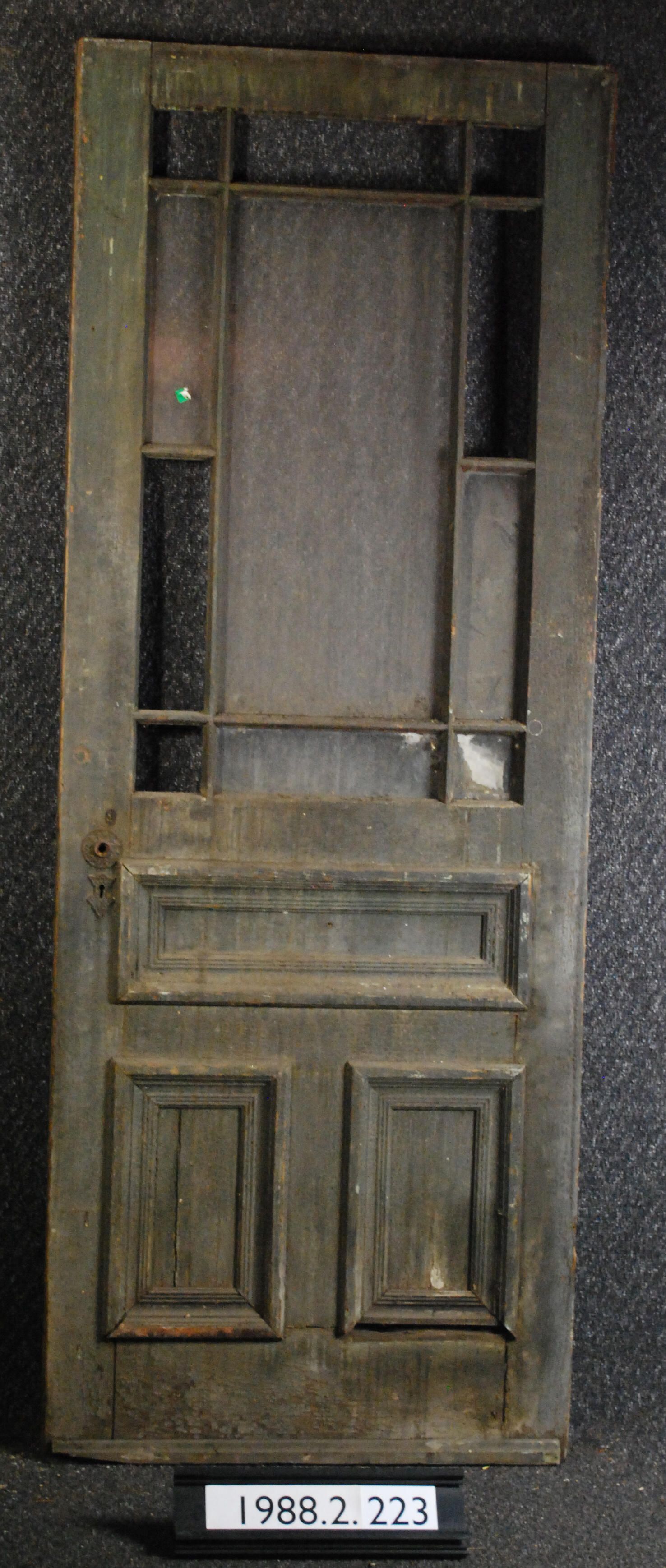 Three panel exterior door. Applied bolection moldings. Has multiple sash openings - some with clear glass panes. Glass is missing in remaining openings. Has two key hole escutcheons, two circular back plates and one mortise lock. All other hardware is missing. Painted brown.