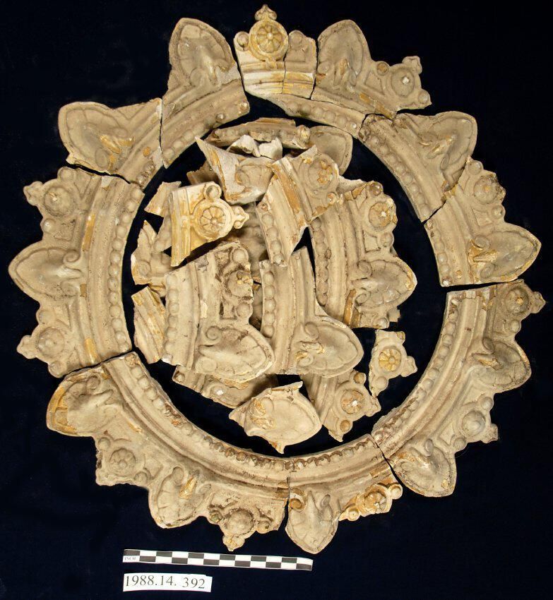 Historic plaster. Multiple fragments from circular ceiling medallion surround. Some match. Together the pieces compose more than one surround.