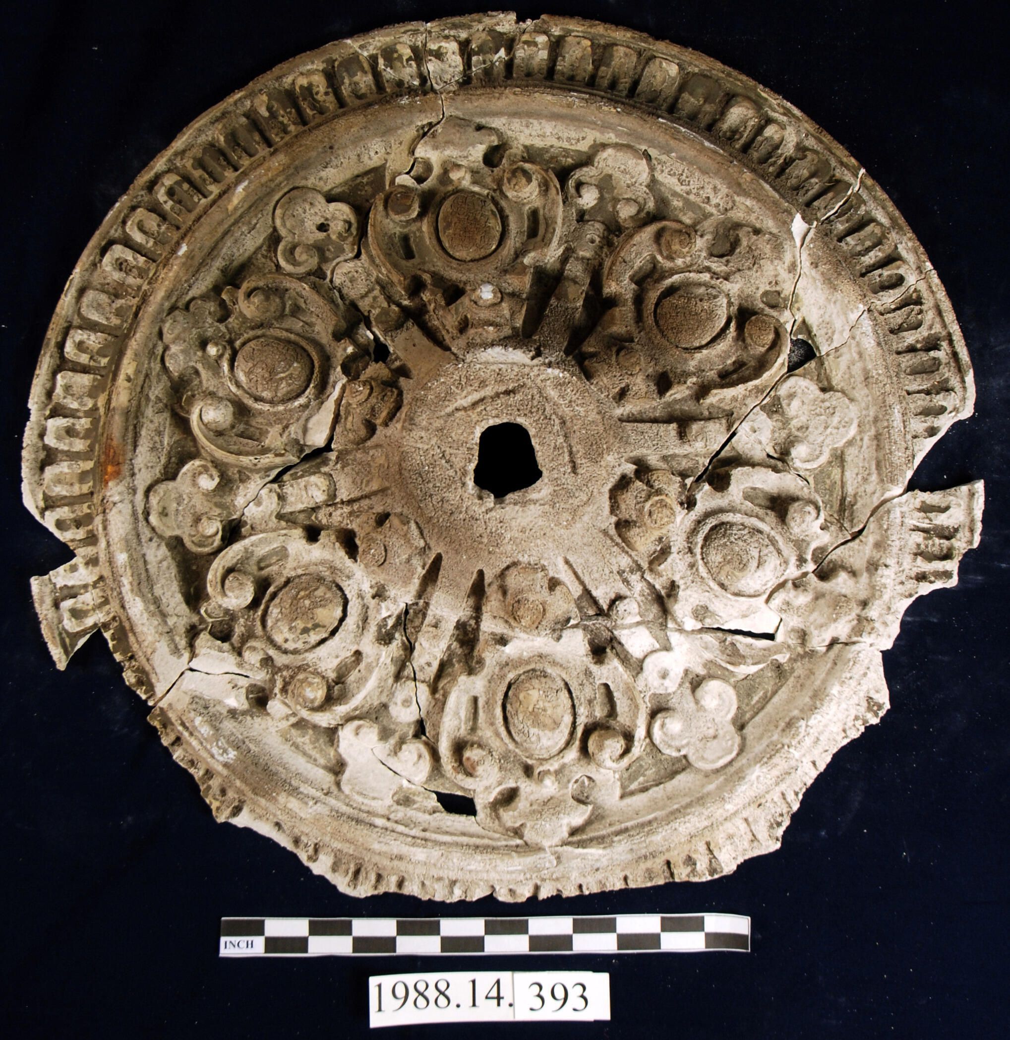 Historic plaster circular ceiling medallion. Broken into multiple fragments. Repeating Rococo scroll / shield motif. Outer perimeter has fluted edge. Paint partially stripped. Plaster deteriorated. Incised score marks on reverse.