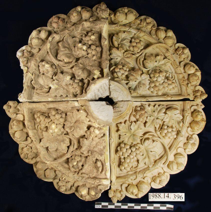 Historic plaster circular ceiling medallion composed of four segments. Grape leaf, vine and grape cluster motif. Outer perimeter has appendages with fruit motif.