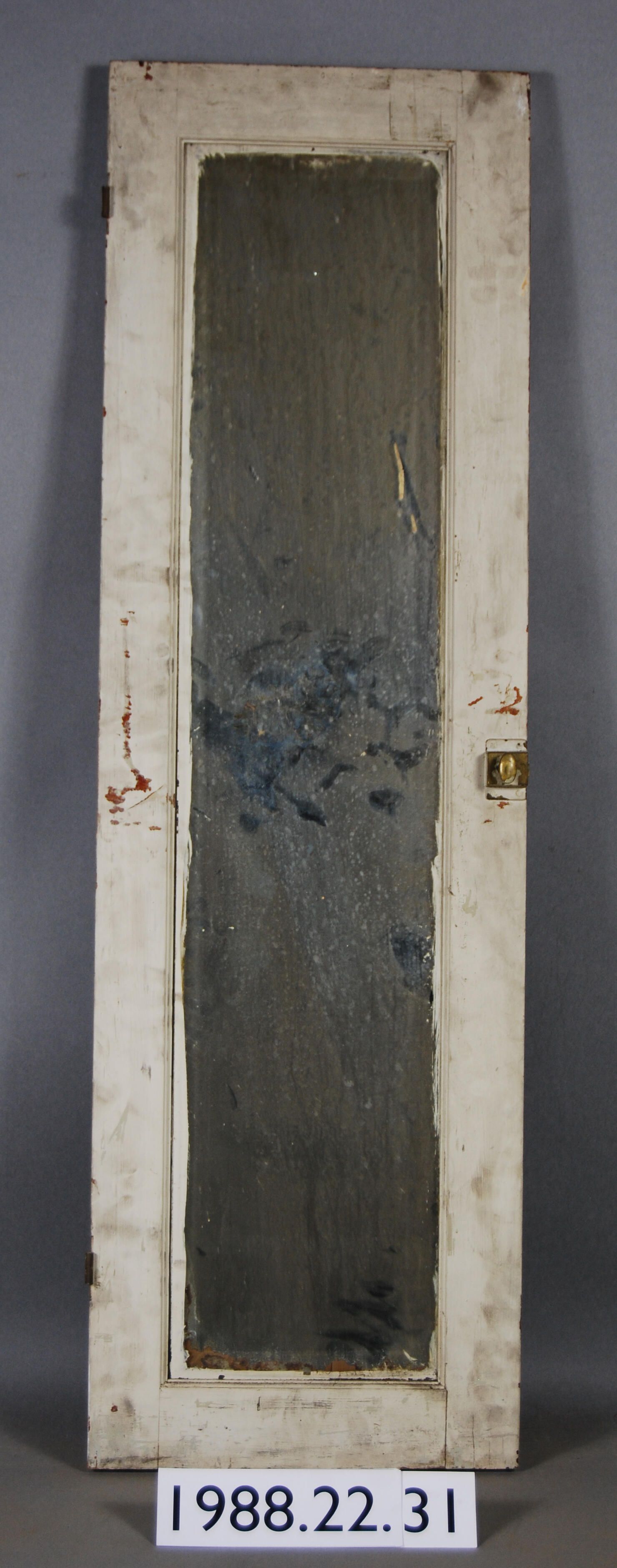 Five panel exterior door., with applied bolection moldings. One panel is missing. Single opening with clear glass. Has mortise lock, three escutcheon plates, and two hinges Has mail slot. Painted greenish-grey on both sides.