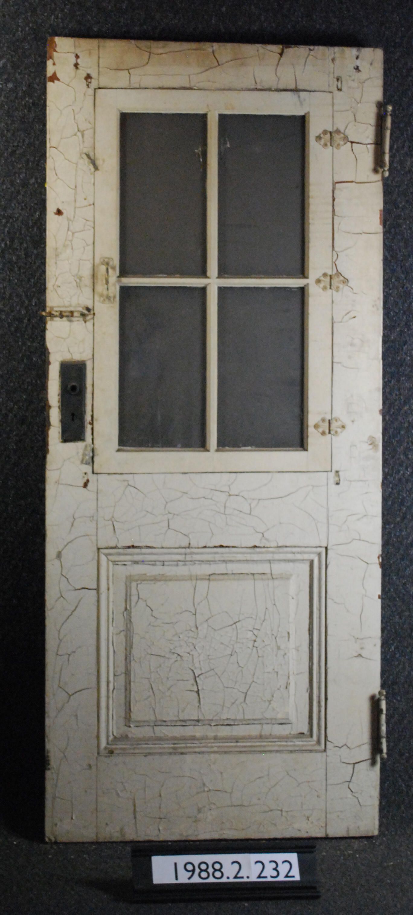 Six panel exterior door., with applied moldings. Hinged sash opening with four panes divided by muntins. Has mortise lock, two back plates, sliding bolt, and two solid brass hinges. Painted beige on one side and green on the other side.