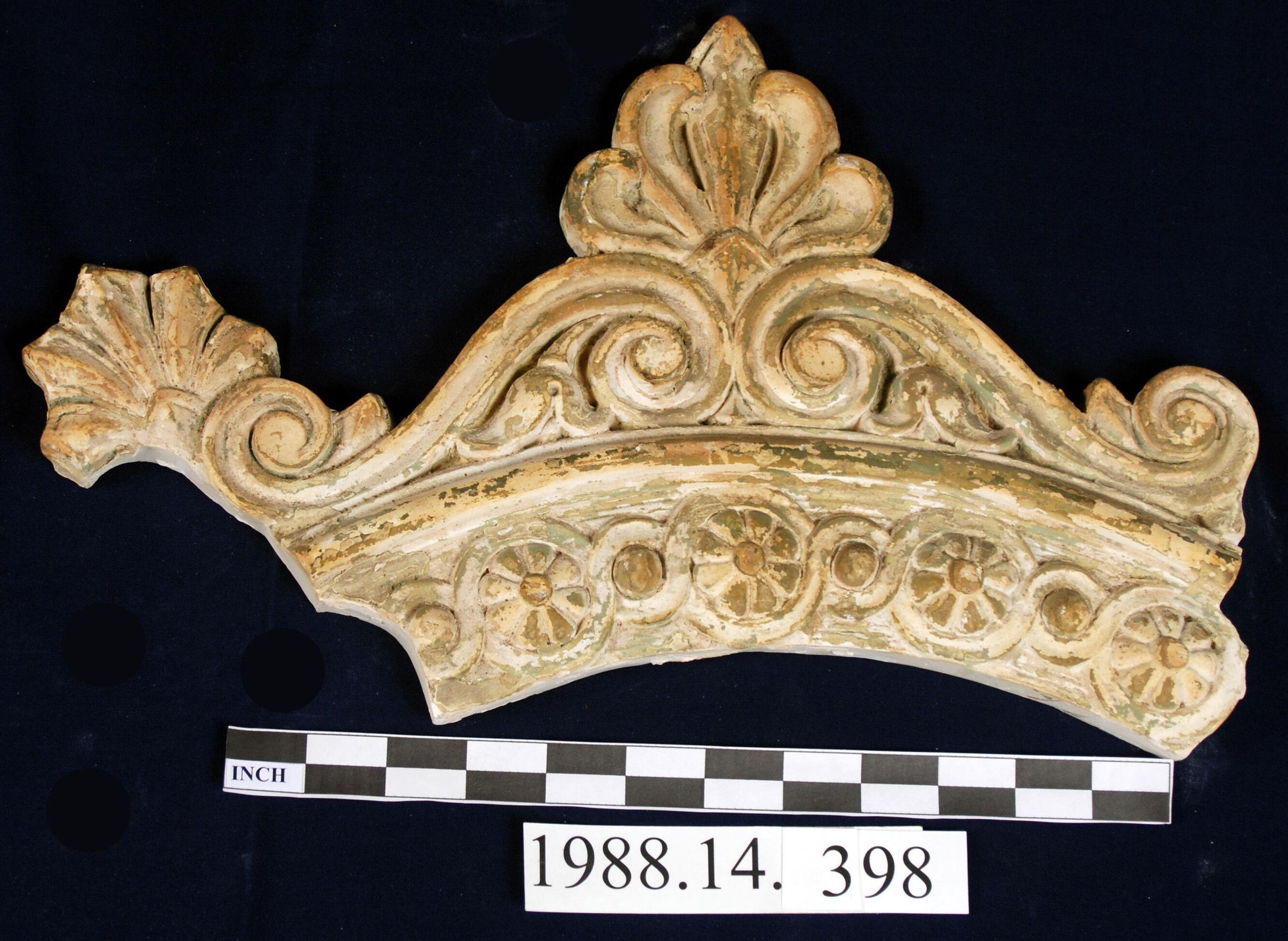Historic plaster,one segment from circular ceiling medallion surround. Rosette and bead with twisted links. Appendages on outer perimeter with stylized leaf and scroll motif. Remnants of original paint. Reverse has incised score marks.