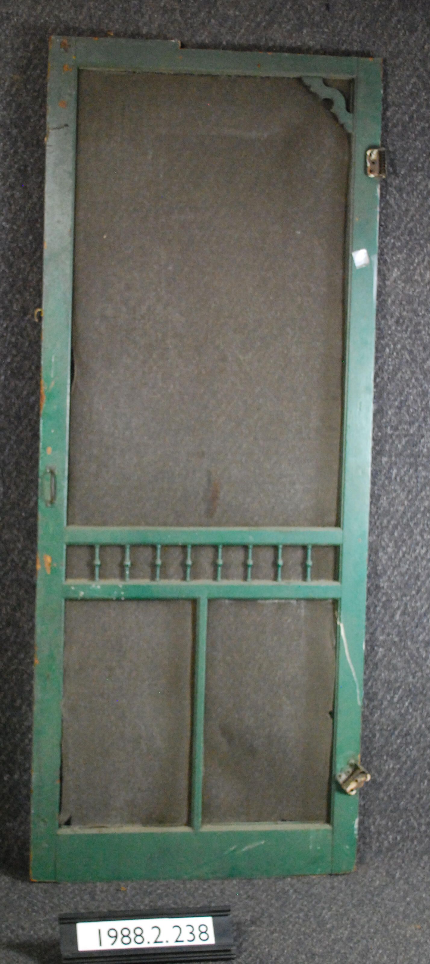 Exterior screen door., with multiple openings within frame. Has spindles and one remaining bracket Wire screen. Spring hinges, and handle. Painted green.