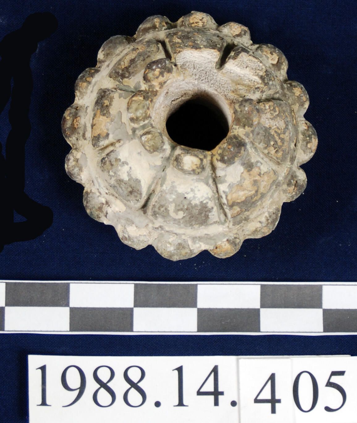 Historic plaster round bulbous centerpiece from ceiling medallion. Central hole. Beaded perimeter. Fluted sides.