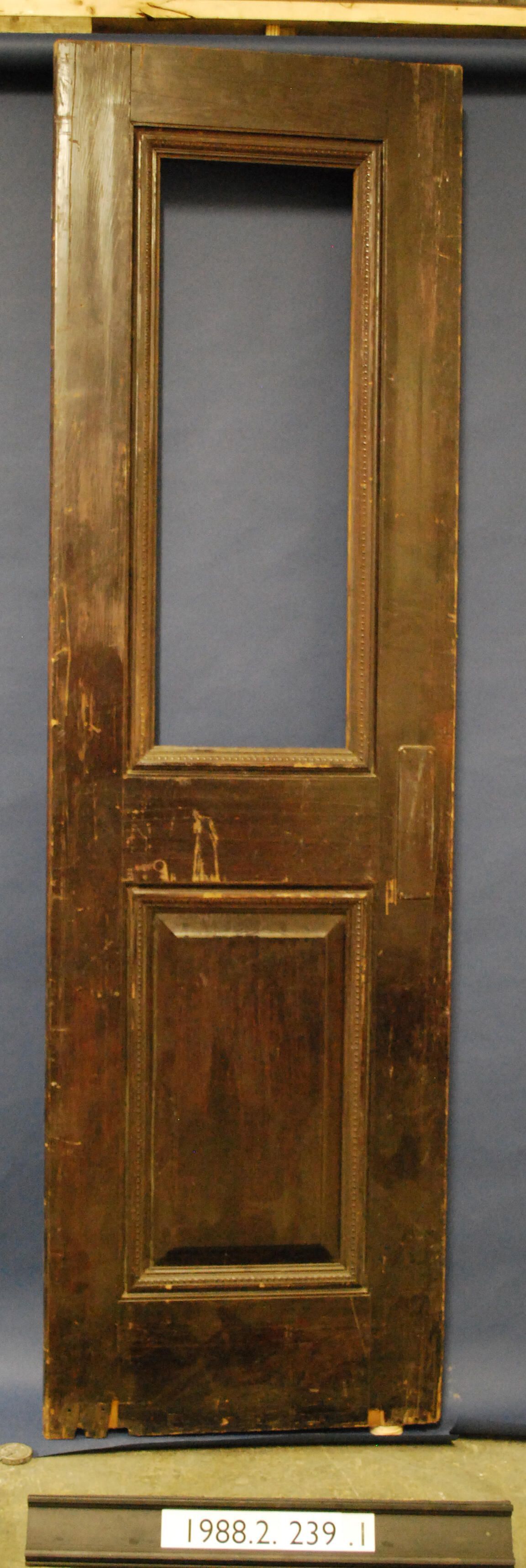 Interior door. One of pair. Originally had pivot hinge to swing in both directions (now missing). Has single panel, and single opening. Glass pane is missing. Applied egg and dart moldings. Varnished on both sides.