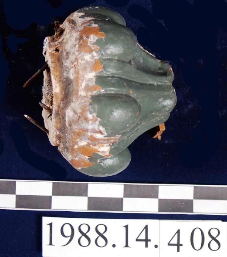 Historic plaster medallion centerpiece, bulbous. Egg / fluting around perimeter. One end has series of wire nails inserted. Painted dark green.