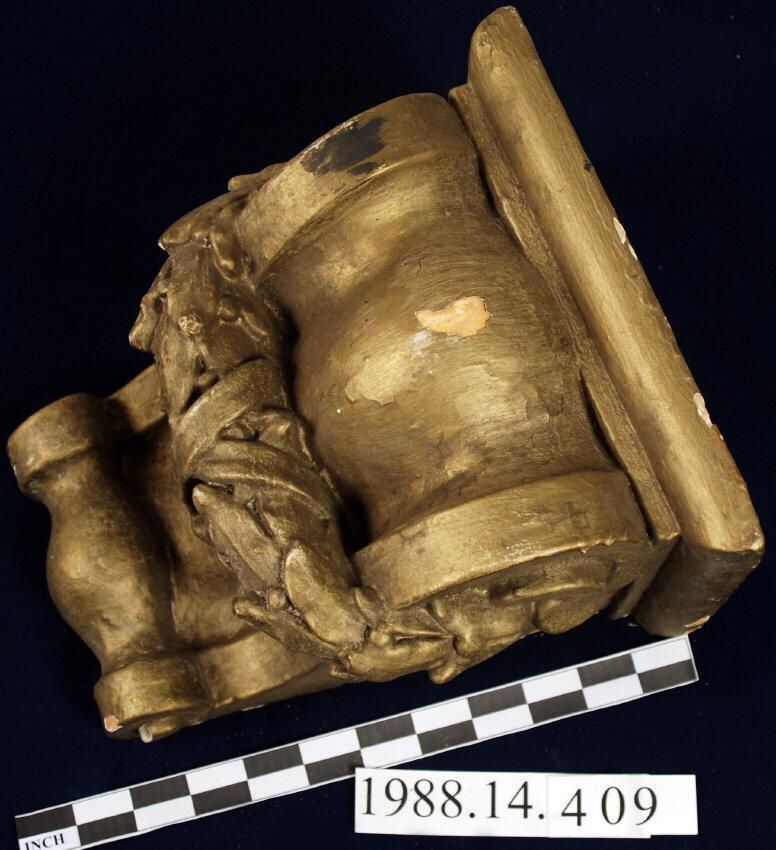 Historic molded plaster bracket reinforced with plant fibre. Scrolled bracket with foliated garland. Painted with bronze paint. Wire fasteners. Hollow construction. Filled with plaster.