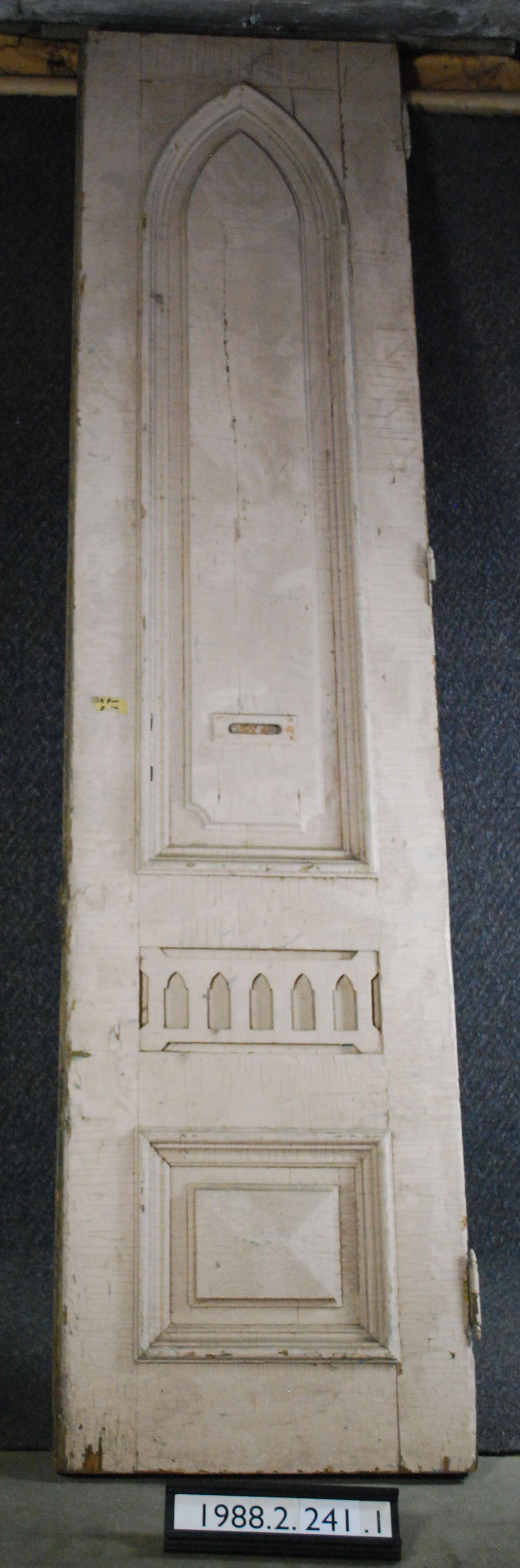 Exterior door. Multiple panels. Gothic revival style applied moldings. Has two complete original hinges, and one hinge leaf. Has mail slot. Has later rim lock strike plate. Has mortise lock, and two escutcheons. Painted beige on one side and grey on the other side.