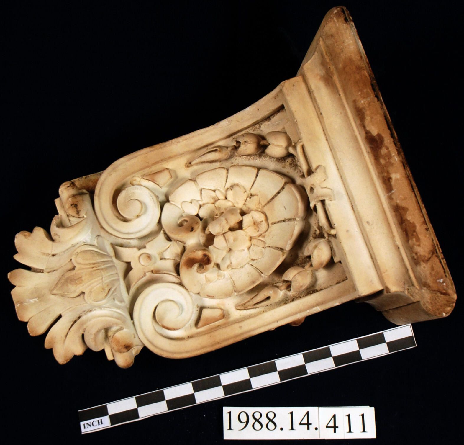 Historic molded plaster bracket. Scroll / Botanical / scalloped shell motif. Foliated pendant. Broken center. Missing piece. Originally painted - now stripped.