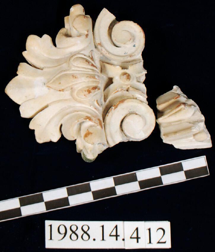 Historic plaster bracket fragments. Foliated lower pendant / side fragment . Same pattern as 1988.14.411. Two fragments from one bracket. Stripped.