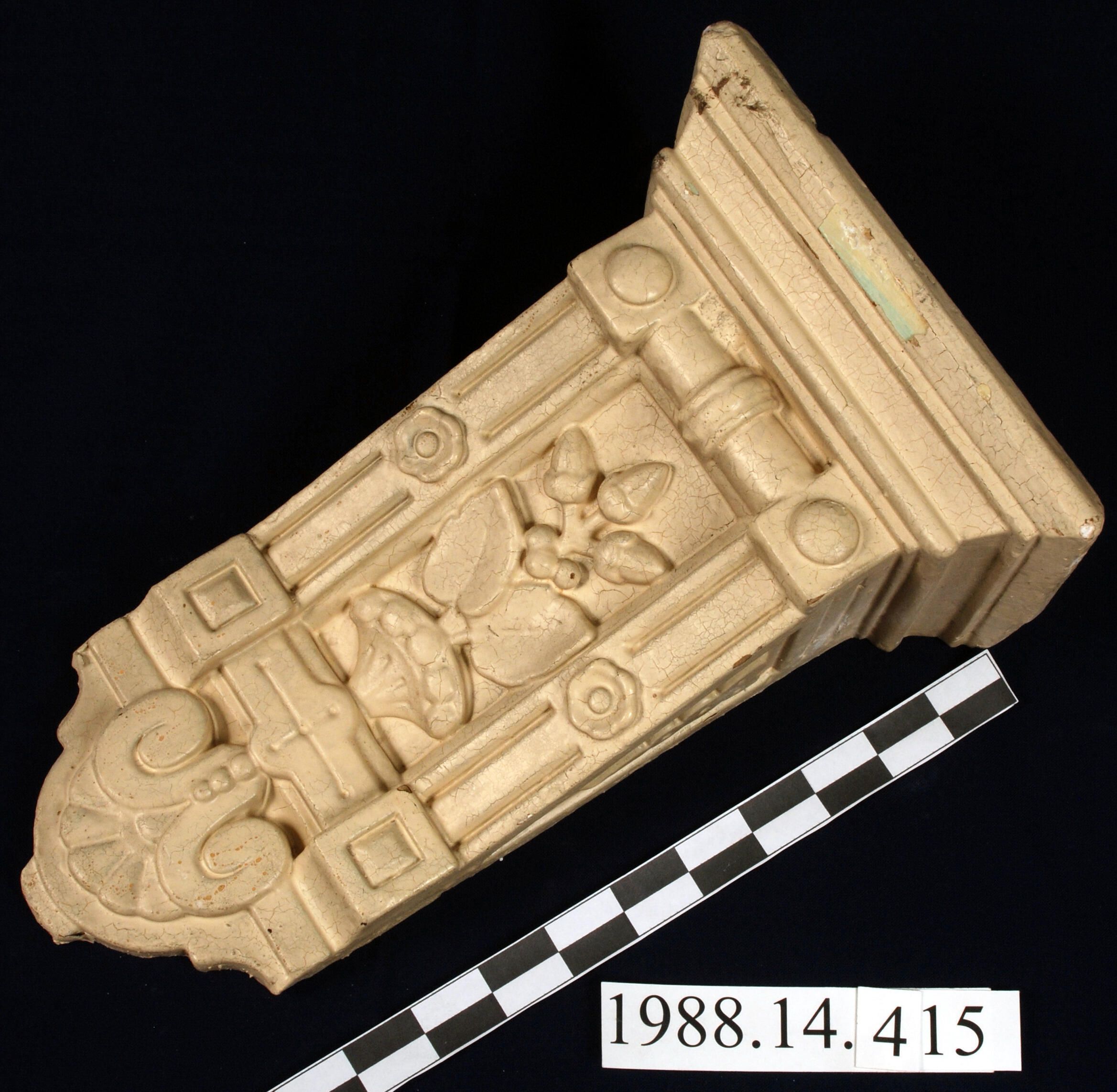 Historic plaster bracket. Acorn and oak leaf design motif within framed recess. Scroll / Sunburst pendant end. Painted cream colored over multiple layers.