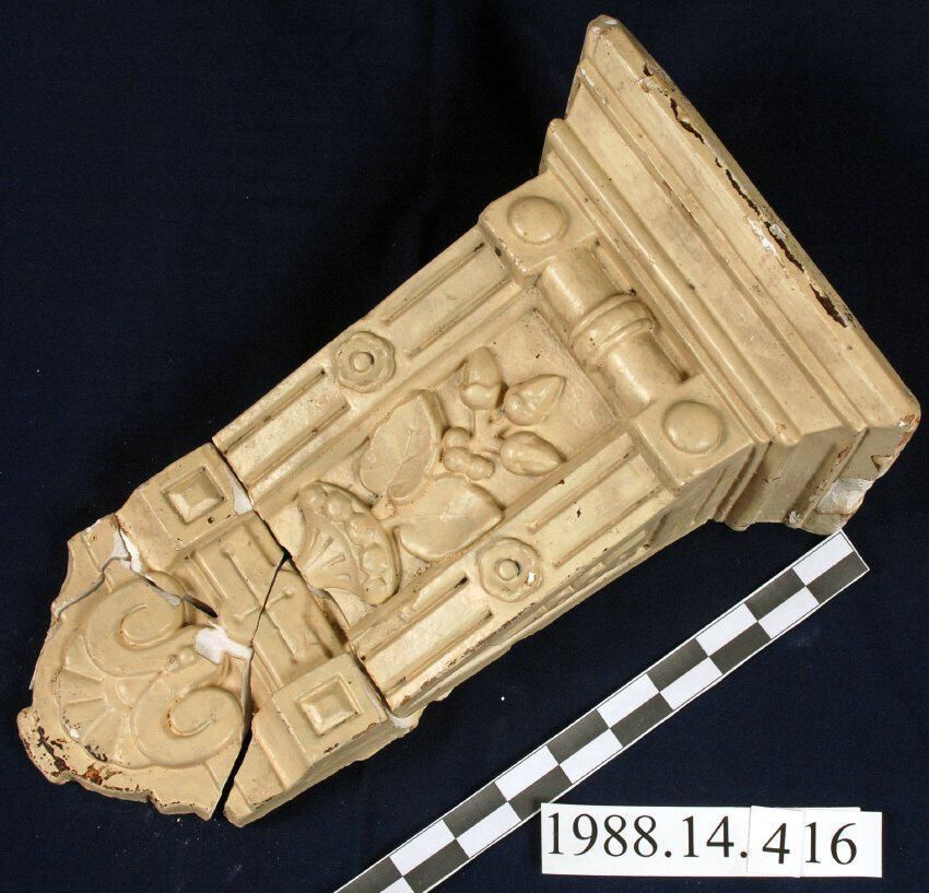 Historic plaster bracket. Acorn and oak leaf design motif within framed recess. Scroll / Sunburst pendant end (broken). Multiple pieces. Painted cream colored over multiple layers.