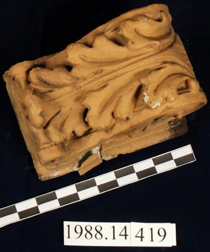 Historic plaster bracket. Acanthus leaf motif and round spool. Scrolled sides. Painted brown. Rein\forced with plant fibre. Has original round wire mounting nails.