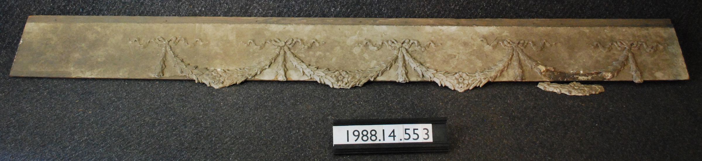 Frieze panel composed of wooden board with flore re-inforced plaster. Classical revival. Botanical garland and ribbon motif. Bits broken and detached. Painted.