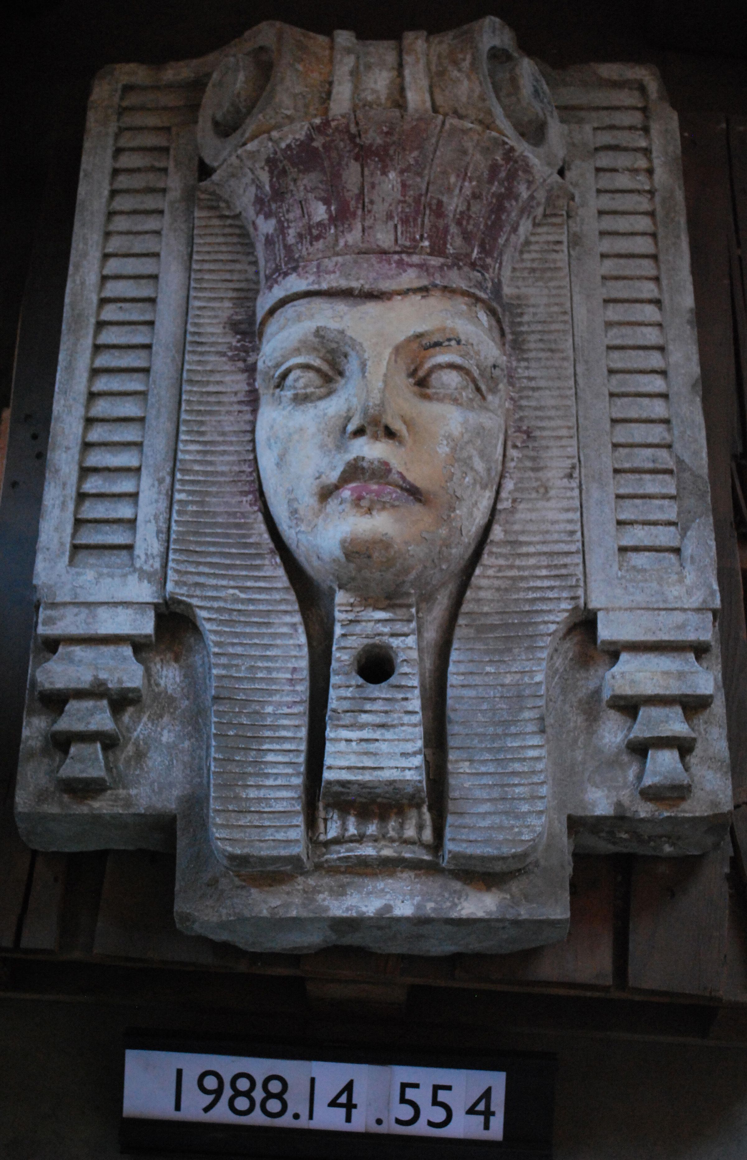 Egyptian revival female figurehead within rectangular cartouche. Made of Portland cement. Decorated with polychrome paint.