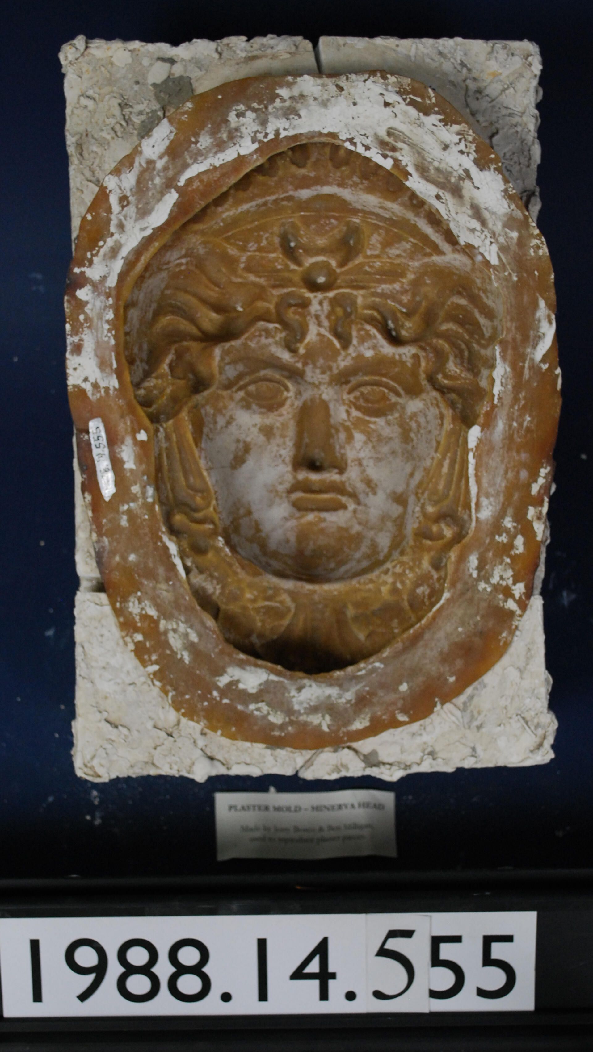 Plaster mother mold. Has latex mold in shape of "Minerva" head. Pattern derived from cast iron architectural ornament. Has four corner block fillets.
