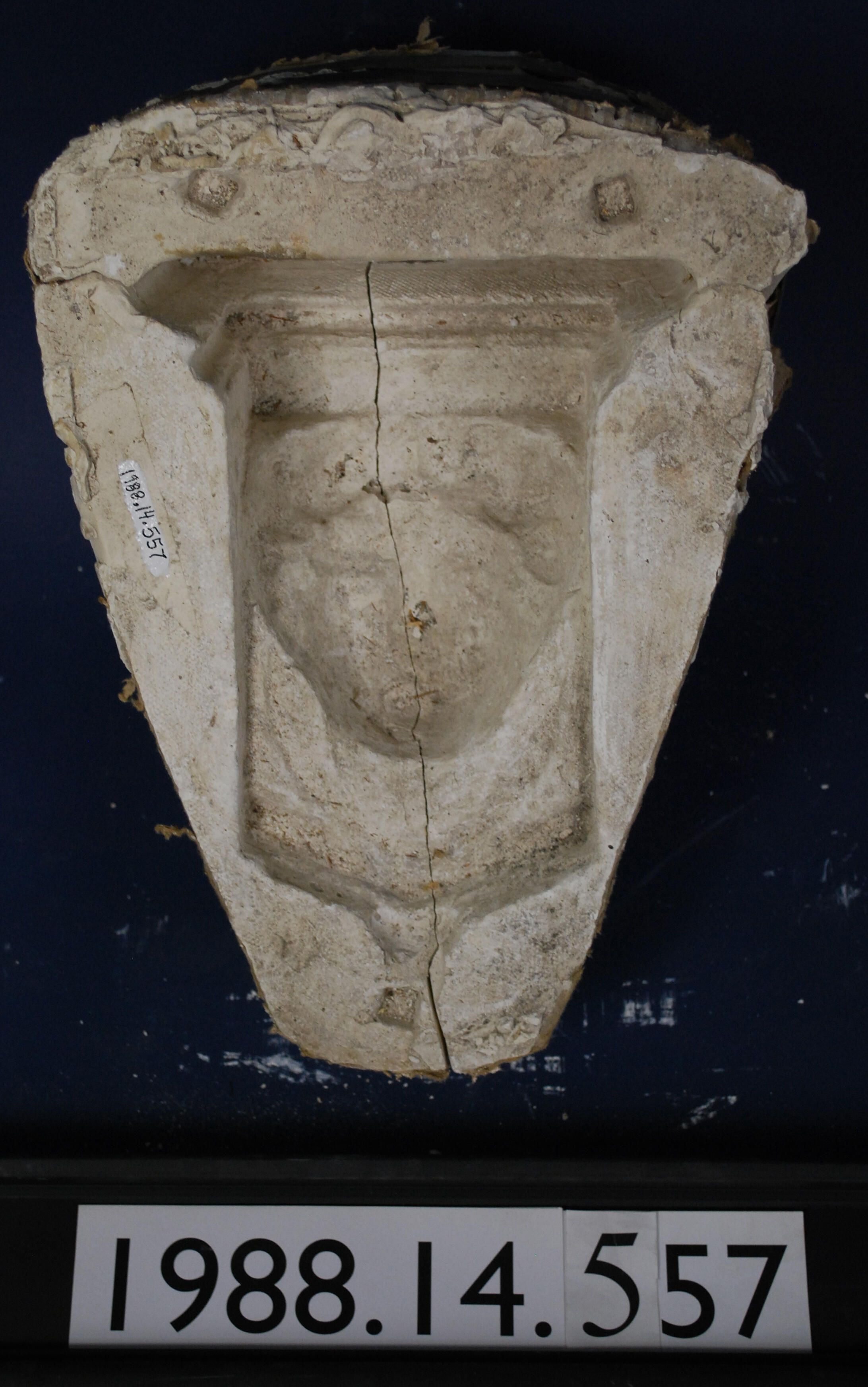 Plaster mother mold in shape of bracket. Two-part. Mold is broken and has piece missing. Latex mold is missing.