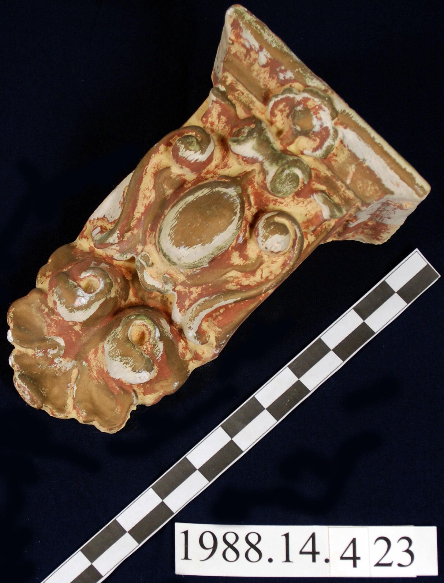 Historic plaster bracket. Rococo Revival style. Egg and scroll motif. Foliated pendant end. Painted red / bronze / yellow over original layers.