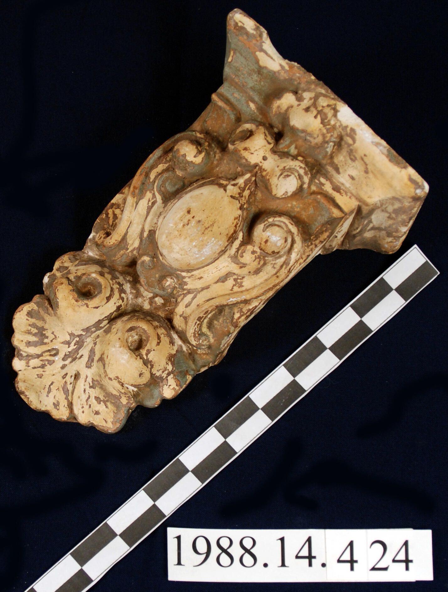 Historic plaster bracket. Rococo Revival style. Egg and scroll motif. Foliated pendant end. Painted but partially stripped.