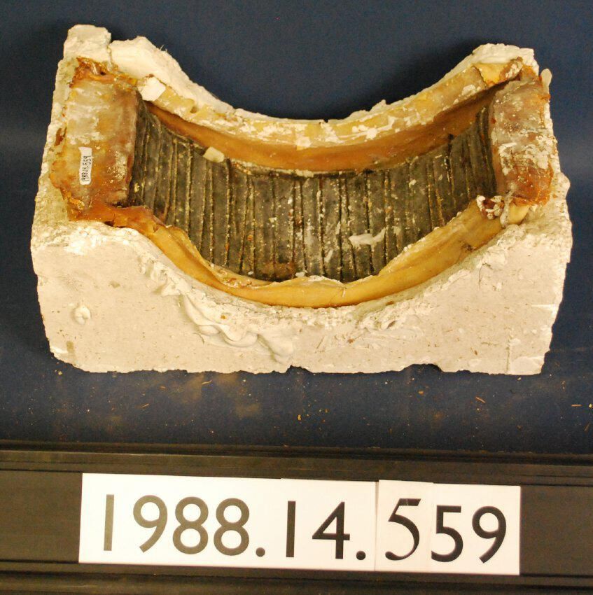 Plaster mother mold. Has latex mold with impression of half of capital ornament. Classical revival botanical motif. Latex is severely deteriated.
