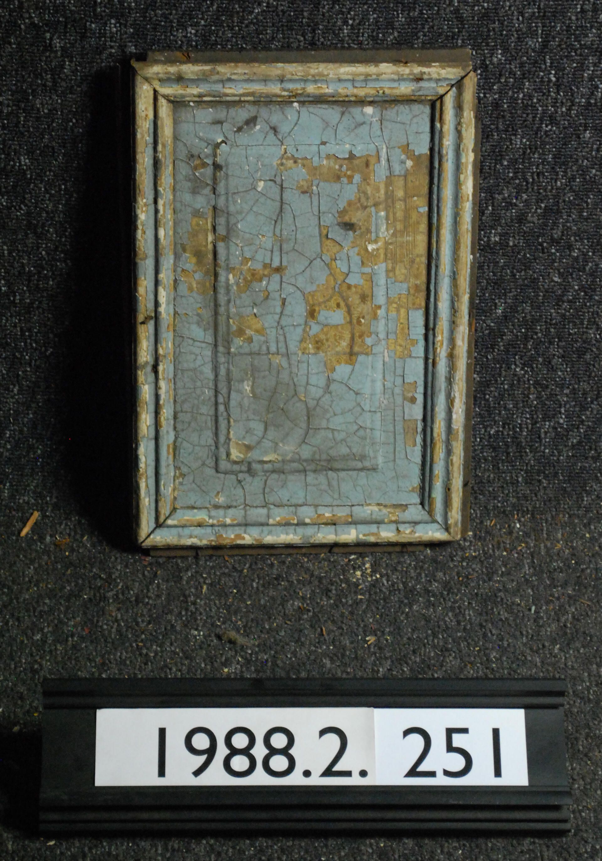 Door panel. Applied moldings. Painted blue on one side and painted white on the other. Inscriptions or Markings: Manufacturer: Place of Manufacturer: Design Motifs: Style: Finish: Painted Blue on One Side and White on the Other Side
