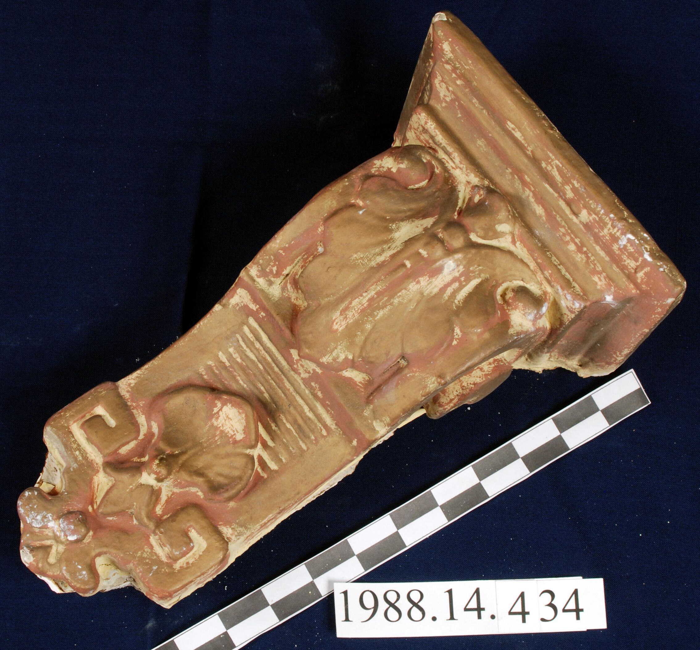 Historic plaster bracket. Compound molded top. Stylized acanthus leaf motif. Horizontal fluting. Leaf / scroll and fret motif on pendant lower end. Sides scrolled. Painted bronze / red and yellow over multiple-layers. Has round wire nails in back.