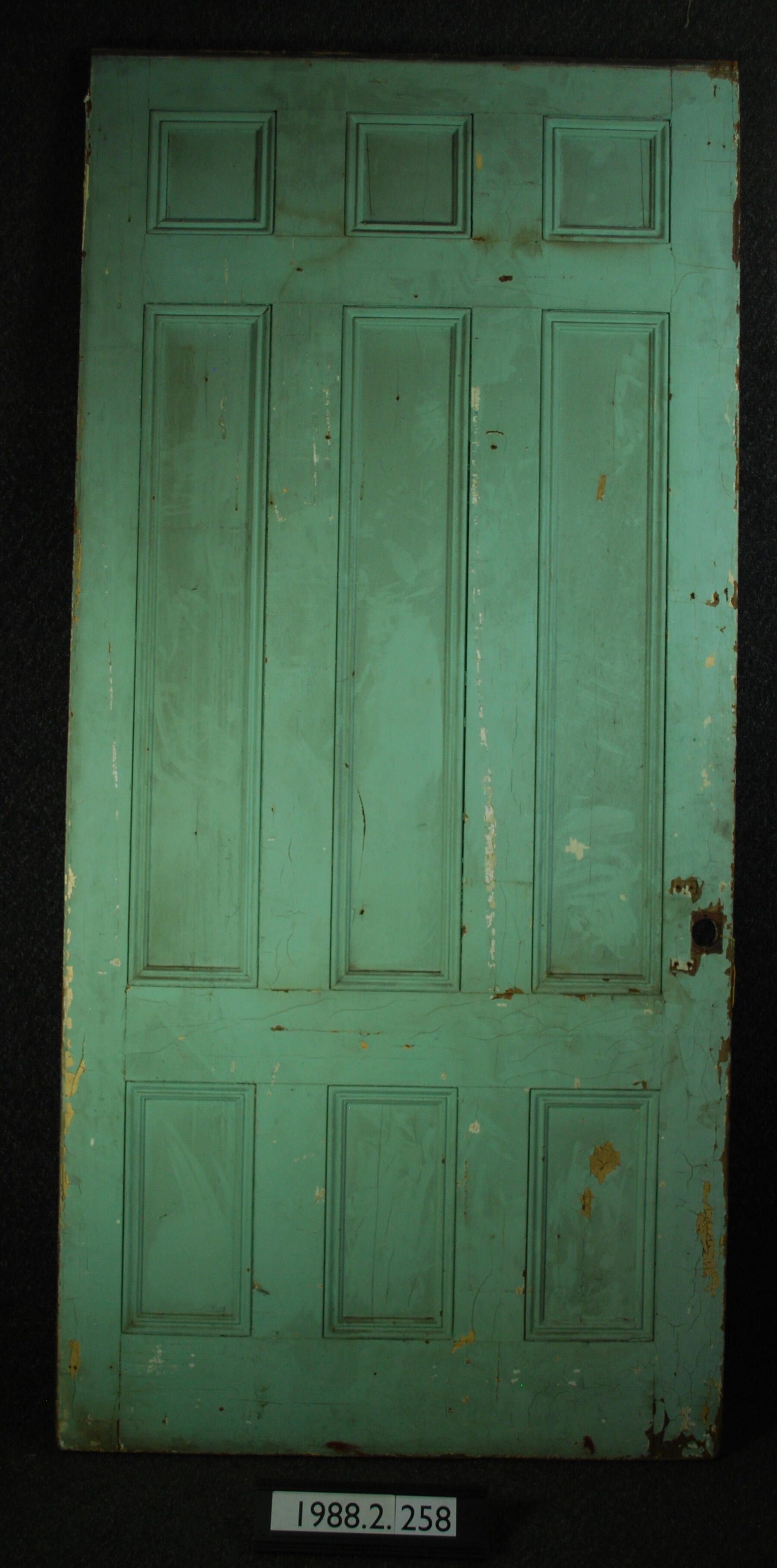 Interior sliding pocket door. Nine panel. Applied moldings. Has roller hardware at bottom. Painted Green on one side and painted cream colored on the other side.