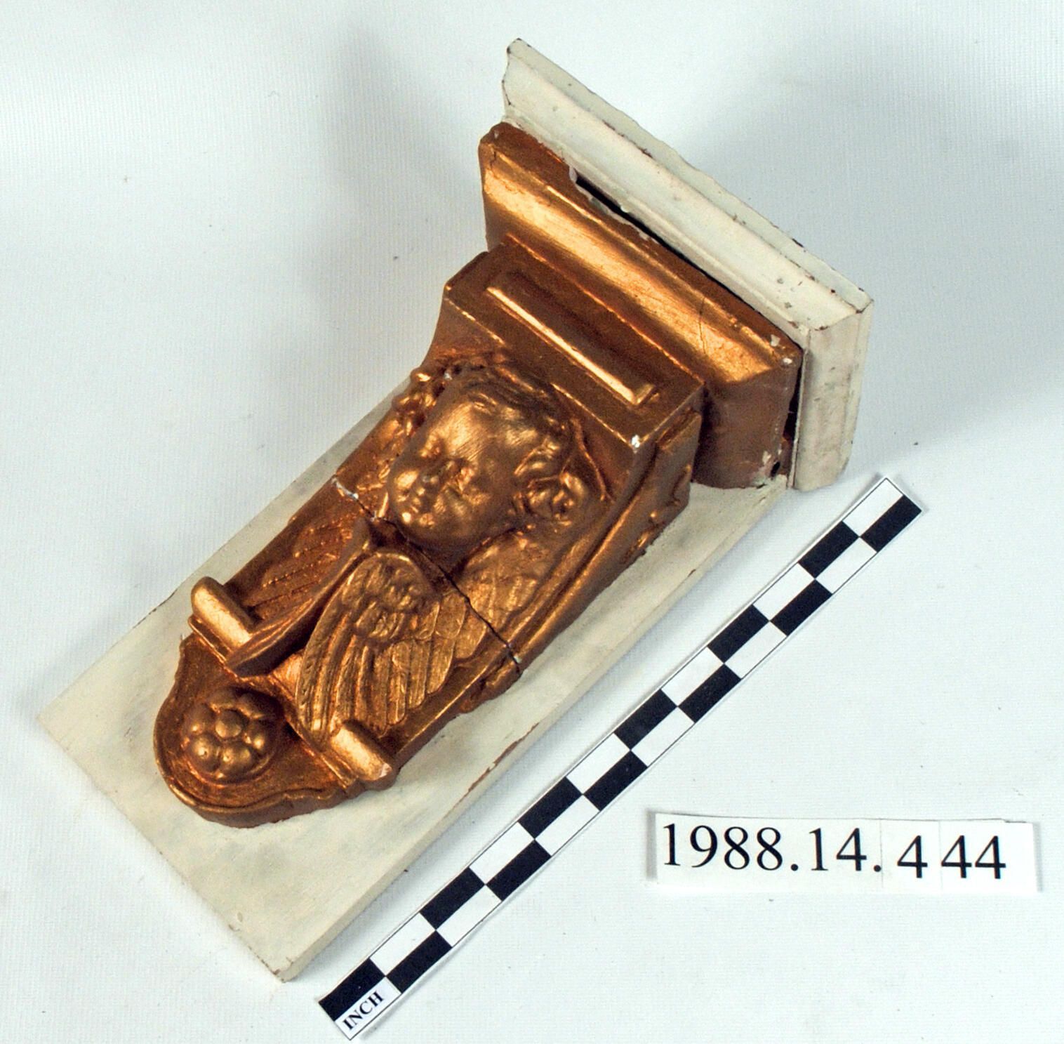Historic plaster bracket. Rectangular top with molded edge. Horizontal bar above relief figurehead of winged cherubs. Lower pendant and with rosette. Later mounted on wood shelf. Sides feature stylized botanical motif. Bronze paint over multiple layers. Broken in half.