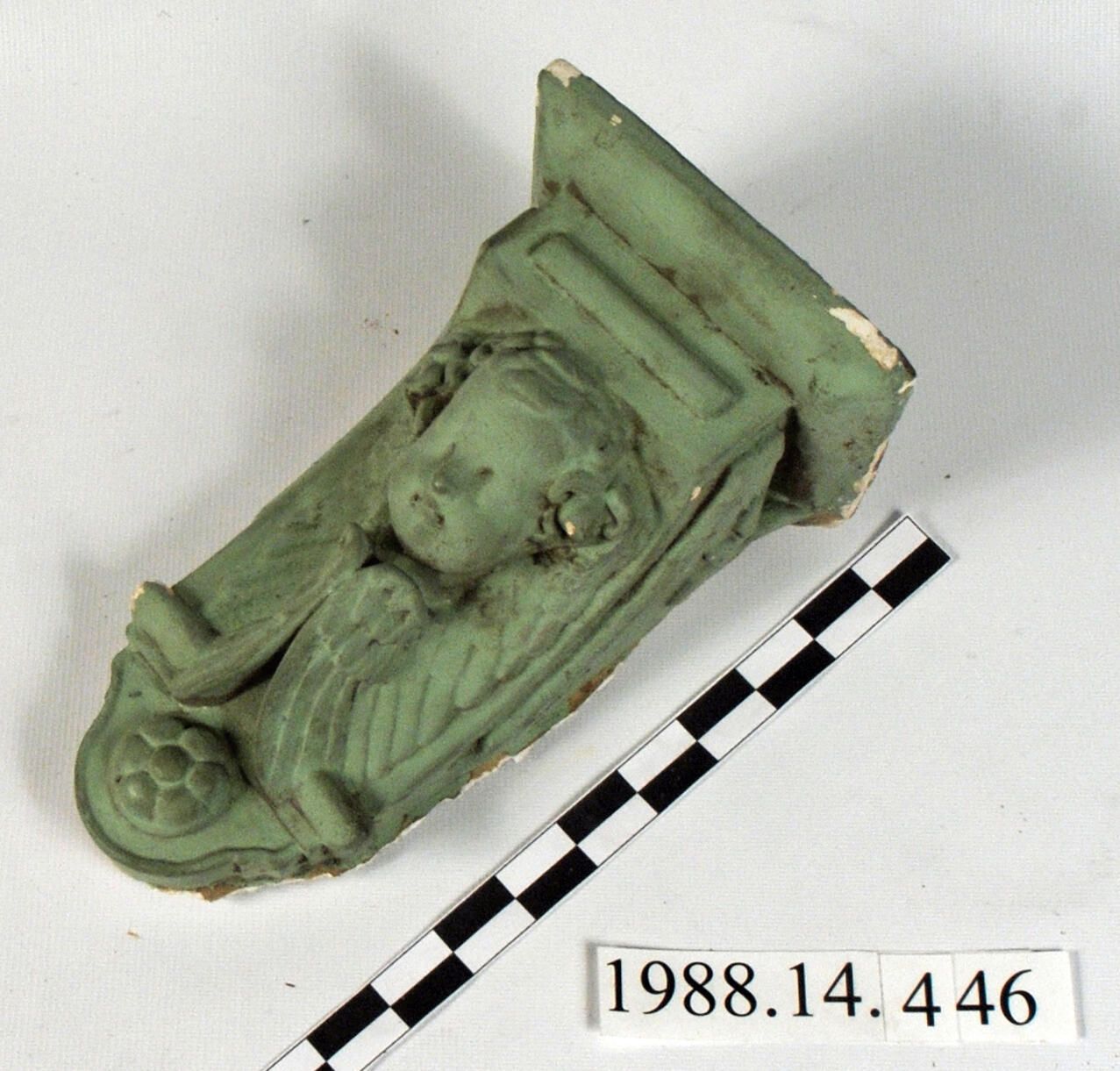 Historic plaster bracket. Rectangular top with molded edge. Horizontal bar above relief figurehead of winged cherub. Has lower pendant end with rosette. Painted light green.