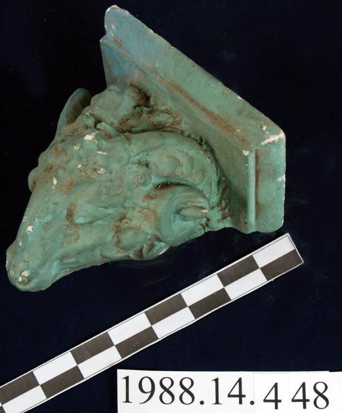 Historic plaster bracket. Rectangular top with molded edge. Relief rams head figure. Wire loop fasteners on back. Painted light (sage) green.