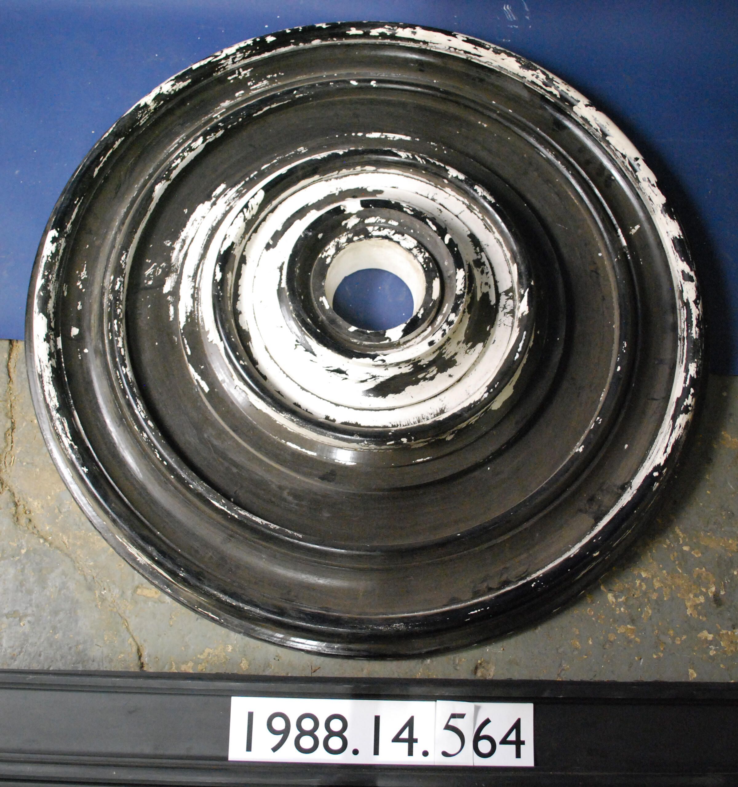 Reproduction plaster ceiling medallion, circular. Formed by raking or molding. Painted black.