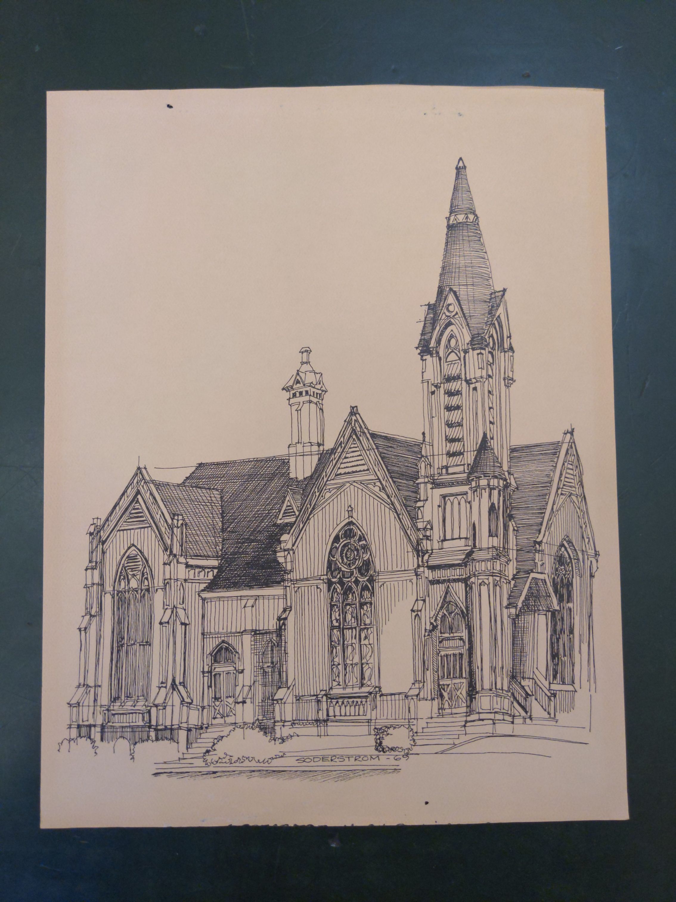 Pen and ink drawing by architect David Soderstrom (Martin, Soderstrom, Matteson) of The Old Church (Calvary Presbyterian) at 1422 SE 11th Ave., Portland, OR. (1969)